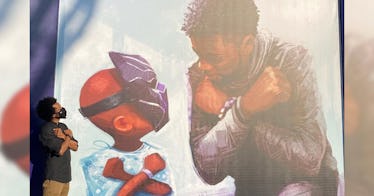艺术家Nikkolas史密斯创建了壁画和揭幕和Instagram发布了一段视频。它显示了Boseman T 'Challa面具和一个年轻的男孩,每个做Wakanda永远致敬。Boseman是接近眼睛水平单膝跪下的男孩。
